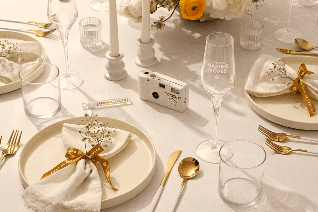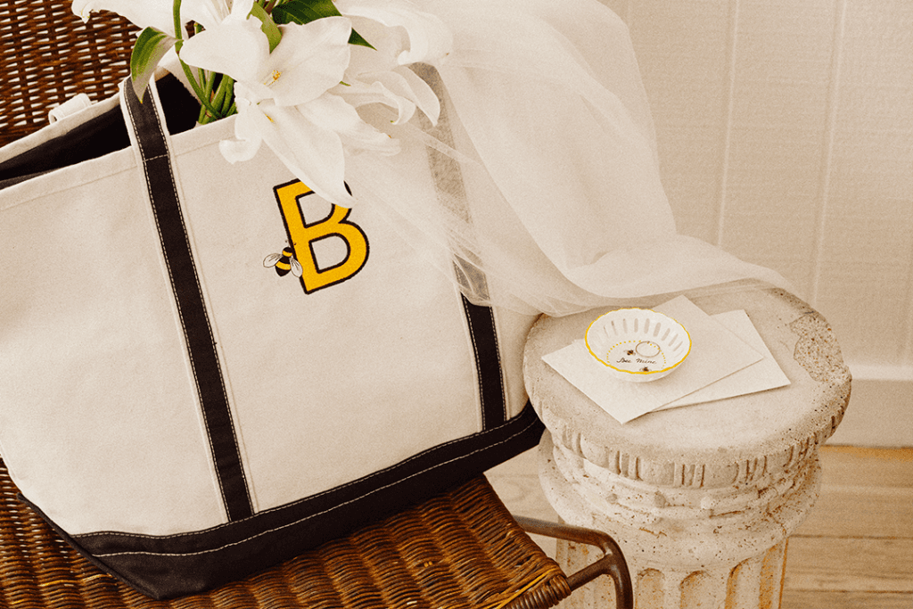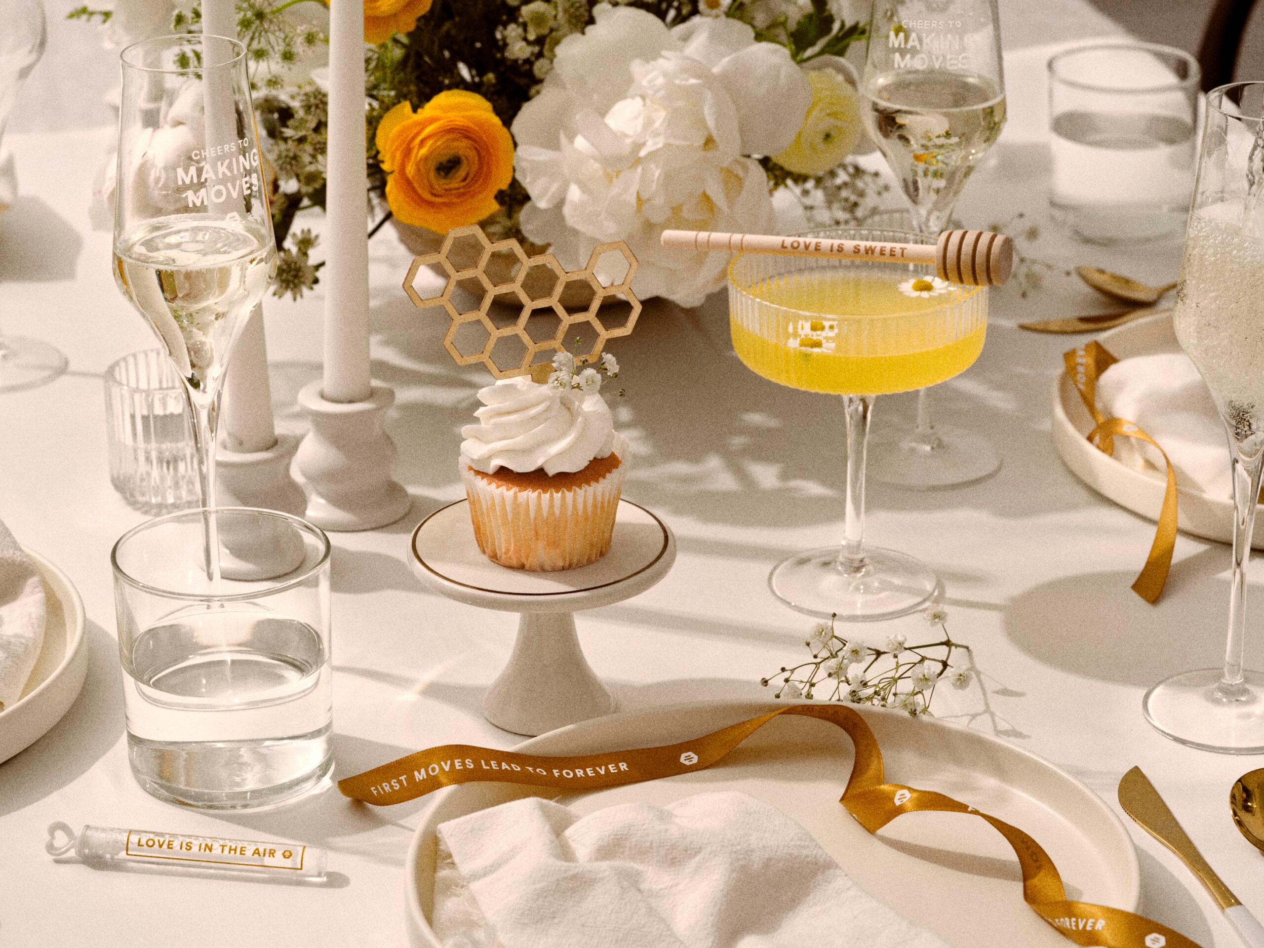 Our first collection, pictured below, features items like honey dipper wedding favors and “Making Moves” champagne flutes that can make for a heartfelt wedding gift. We’ve also partnered with wedding brand Over The Moon to create two special items: a limited-edition porcelain ring dish and a personalizable tote bag, complete with a sweet bee design.