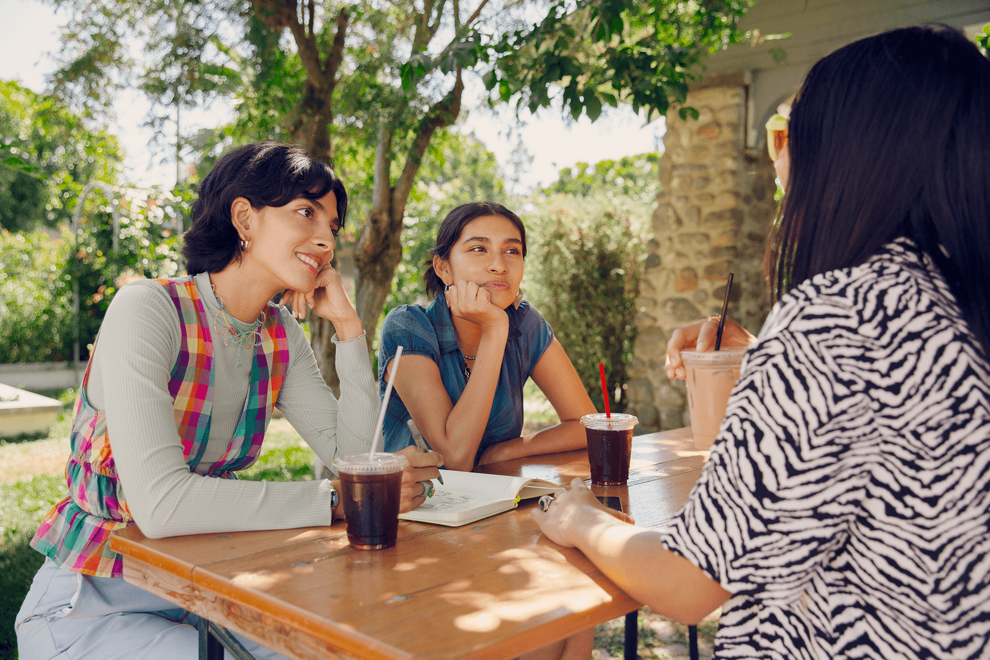 Three friends sitting together. One is wearing a yellow hoodie the other is wearing a red shirt. Another one is wearing sunglasses. It's a sunny day.